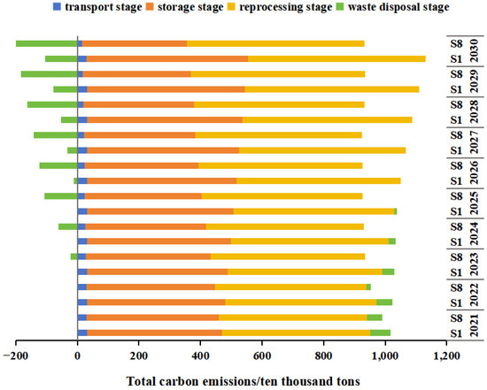 The reprocessing stage is represented by a single baseline scenario (BS). The consumption of various food types is projected based on current trends. The primary energy source used in cooking is natural gas. Since natural gas is considered to be a clean energy source and further reductions in carbon emissions through process improvements are relatively challenging, no additional scenarios are established for this stage.