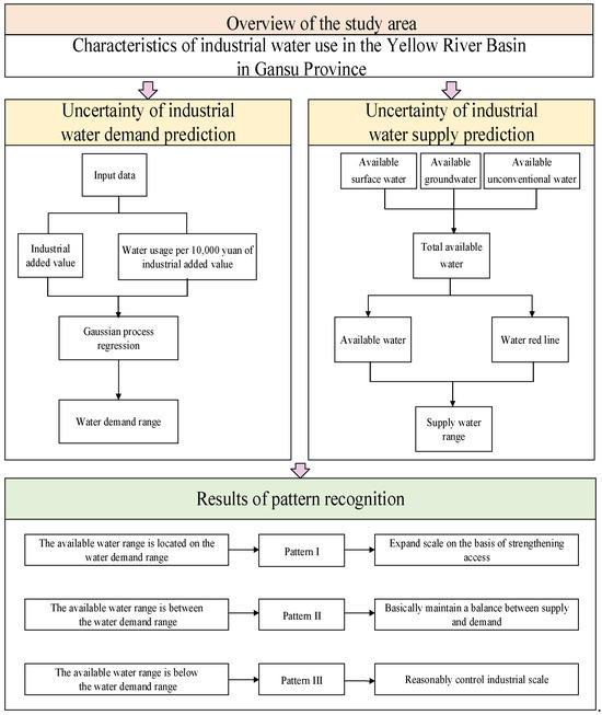 This research adopts a probabilistic prediction approach to analyze water demand, incorporates supply-side uncertainties, and proposes a pattern to identify the supply and demand balance of industrial water in the Yellow River Basin of Gansu Province based on the range of water demand and the range of water supply. Figure 1 shows the framework for pattern recognition of supply and demand balance under uncertainty.