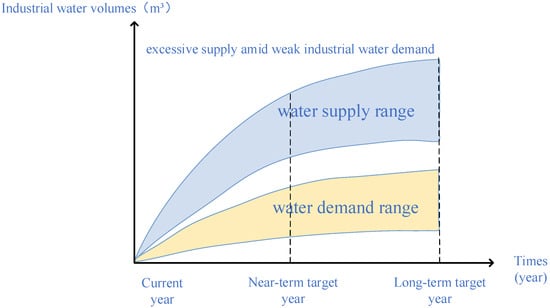 - Pattern I (excessive supply amid weak industrial water demand): If the range of water supply is higher than the range of water demand, it indicates that the supply exceeds the demand, and the range of water demand is weak. There is still considerable potential for growth in this pattern; however, it remains essential to strengthen market access and adhere to the principle of ‘innovation-driven, green leadership’. Efforts should center on enhancing efficiency, promoting the industry’s transformation towards green, high-end, and intelligent development, and establishing a sustainable, innovative, and efficient industrial framework.