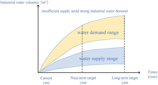 - Pattern III (insufficient supply amid strong industrial water demand): When the range of water supply is below the range of water demand, it indicates that there is insufficient supply against strong demand. At this time, industrial development is constrained by water resources. Based on the comprehensive measures of structure, technology, and management, on the one hand, the industrial scale should be reasonably controlled and compressed to minimize the threat of water shortage to economic and social development; on the other hand, following the basic principles of real need, ecological safety, and sustainability, the industry and economy should be promoted on the basis of high-level protection through the adjustment of indexes or the optimization of water resources allocation projects on the basis of full selection. High-quality economic and social development is based on a high level of protection.
