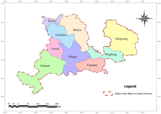 Gansu is located in the upper reaches of the Yellow River and is the third province through which the Yellow River flows. It holds a very important position in China’s economic and social development and ecological security. The Yellow River Basin of Gansu Province covers an area of 142,700 km2, accounting for 33% of the land area of Gansu Province, specifically including nine prefecture-level cities of Gannan, Linxia, Wuwei, Lanzhou, Baiyin, Dingxi, Tianshui, Pingliang, and Qingyang (Figure 5). The Yellow River Basin of Gansu Province is an important comprehensive energy base in China, and the current traditional industries such as petrochemical, metallurgy and non-ferrous metals, equipment manufacturing, etc., account for a relatively high proportion in the industrial structure and are the pillars of the province’s industrial development. According to the Gansu development yearbook 2023 [33] and 2022 Gansu Water Resources Bulletin [34], the industrial water consumption in the Yellow River Basin of Gansu Province has shown a decreasing trend year by year since 2010, from 1.061 Gm3 in 2010 to 375 Mm3 in 2022, a decrease of 64.66%; the proportion of industrial water to the total water consumption has decreased from 23.11% since 2010 to 9.44% in 2022.