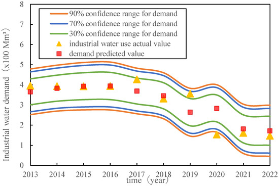 As the capital of Gansu Province, Lanzhou serves as a relatively representative example of the region’s unique characteristics and plays an important role in illustrating the broader social, economic, and cultural aspects of northwestern China. To verify the prediction performance, historical data from 2013 to 2022 for Lanzhou were selected for training, which provided the range of industrial water demand at 30%, 70%, and 90% confidence levels (Figure 6). The results show that the GPR algorithm achieved a MAPE of 16.8% and CP of 90%, 90%, and 80% for the confidence levels of 30%, 70%, and 90%, respectively. Considering the error analysis in its entirety, the prediction result at the 30% confidence level was adopted. The prediction of industrial water demand for the Yellow River Basin in Gansu Province in 2030 is shown in Table 1. The results show that at the 30% confidence level, the industrial water demand ranges from 472 Mm3 to 839 Mm3.