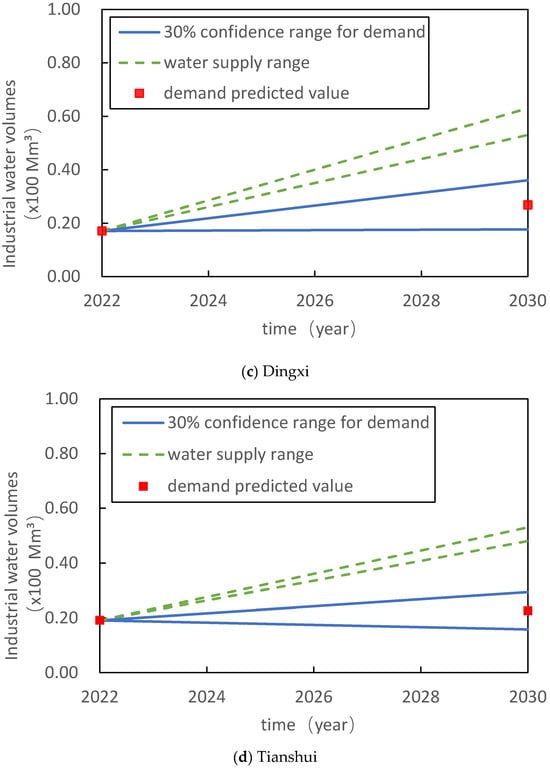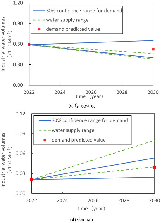 Pattern II of supply and demand balance in the Yellow River Basin in Gansu Province is mainly distributed in Wuwei, Pingliang, Qingyang, and Gannan, and the pattern recognition is shown in Figure 8. It can be seen that in 2030, the water supply range in the region is between the water demand range, and the supply and demand balance pattern is a Pattern II. In the future period, Wuwei belongs to the Longzhong region, Pingliang and Qingyang belong to the Longdong region, and Gannan belongs to the upper reaches of the Yellow River Basin, and it is necessary to further release the elasticity space of the region’s industrial water demand on the basis of maintaining the balance of supply and demand and to realize the coordinated development of the industrial economy and water resources.