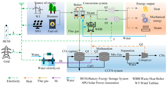- Improving the energy supply stability of the system by integrating the CCUS system to post-treat the flue gas of the industrial supply system and adding an energy storage unit to cope with the volatility and instability of renewable energy sources.