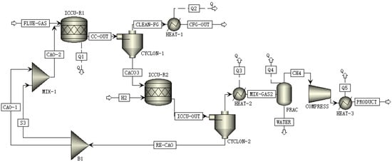 Simulation of the CCUS system in Aspen Plus: The simulation in Aspen Plus consists of the following steps: the input of components, specification of flow strands, selection of the physical property method, identification of conventional and non-conventional components, and definition of the process’s flow diagram (using unit operation blocks and connecting the components and energy flow). In the study of this paper, the PR-BM physical properties method is used, which can be used to simulate the case of the mixtures of hydrocarbons, CO2, and H2. The process flow diagram of the system is shown in Figure 2, where the flue gas from the conversion system first enters the fluidized bed for CO2 capture, setting the reaction efficiency of CO2 to 85%, and then, the heat of the gas is extracted from the solid separator. The solids are separated from the gas with a separation efficiency of 100%. The CaCO3 generated after the reaction flows into the reactor with a slight excess of H2 for the reaction (95% conversion). The solid and gas are separated after the reaction. The CaO obtained is recycled, and the water in the gas is separated so as to obtain high-purity CH4, and compression is carried out to obtain the desired product [30]. In this regard, the module’s selection and specific description of the system’s equipment units are shown in Table 1. The reaction condition parameters are shown in Table 2, and the reaction equations in the two reactors are shown below:
