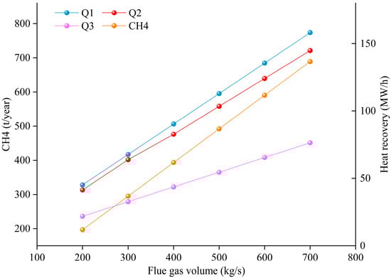 Table 3 shows the simulation results of methane production and the heat recovery of the system in comparison with Ref. Their relative errors are 4.82%, 4.37%, 3.57%, and 1.57%, respectively. Considering that the system’s reaction is assumed to be an isothermal steady-state reaction during the simulation and the effect of pressure is ignored, thermodynamic equilibrium cannot be reached in the actual reaction, so this error value is acceptable. And in order to illustrate the feasibility of the system more accurately, the input flue gas situation with different flow rates is analyzed, and the results are shown in Figure 3.