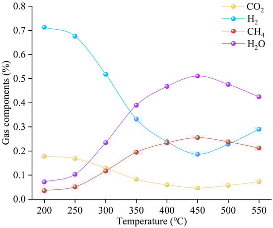 In order to examine the effect of temperature on the methanation process, a sensitivity analysis was performed. The effect of temperature variations between 200 and 550 °C on the gas composition is shown in Figure 4. From the figure, it can be seen that the contents of CH4 and H2 increase as the methanation temperature keeps increasing from 200 °C to 450 °C. When the temperature is between 450 and 550 °C, the contents of CH4 and H2 decrease, and the contents of CO2 and H2 increase. This is a similar trend to that in the study of Cui et al. This is due to the fact that the methanation reaction process is affected by both heat-absorbing and exothermic reactions, e.g., the methane steam-reforming reaction is a heat-absorbing reaction and is accompanied by side reactions such as the RWGS reaction. Methanation is an exothermic reaction, so at lower temperatures (200–450 °C), it favors the forward reaction and promotes methane production, while when the temperature is higher (450–550 °C), it favors a reverse reaction and is accompanied by a heat-absorption reaction and a side reaction, both of which affect methane production. In summary, the choice of the temperature for methanation at 450 °C is an appropriate one.