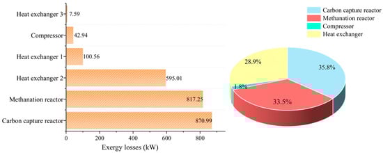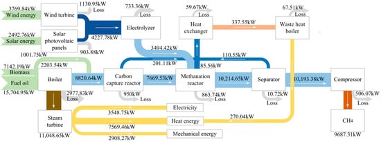 - Fuel oil and biomass contribute 48.60% and 22.10% of the energy, respectively, and waste heat boilers provide an additional 270.04 kW of heat energy. The exergy loss of the carbon capture reactor is the largest, accounting for 35.8% of the total loss. It is generally possible to optimize the operating conditions of carbon capture reactors (temperature, pressure, and catalyst), improve the design of heat exchangers, and adopt more efficient heat exchange technology to reduce exergy loss.