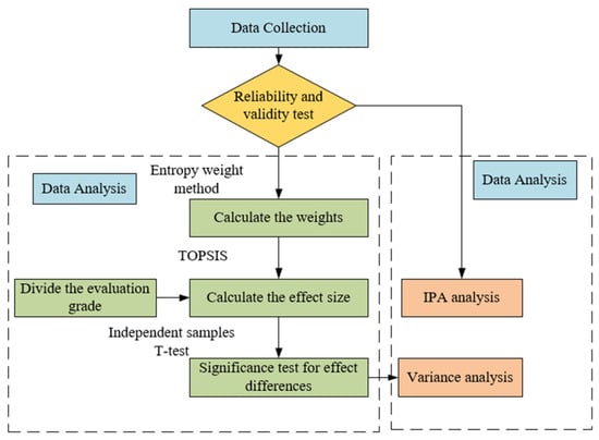 This article primarily utilizes the Entropy Weighted TOPSIS method to calculate the effect values of tourism in promoting rural revitalization for the two villages. It also employs IPA (Importance–Performance Analysis) quadrant diagrams and independent sample t-tests to describe the effect differences between the two villages in a combined graphical and tabular format. For details of the implementation process, please refer to Figure 2.