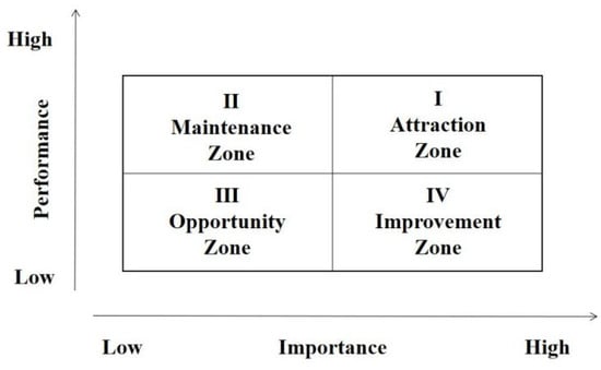 The IPA Method, also known as Importance–Performance Analysis, provides a more visual and intuitive evaluation of satisfaction. It constructs a quadrant analysis chart with importance on the X-axis, satisfaction on the Y-axis, and the means of both as the origin Figure 3 [85]. The advantages of the IPA method lie in its intuitive and clear model, which is easy to understand and can clearly display the priority of various projects, facilitating quick decision-making by managers. Therefore, this study employs the IPA method to visually present the 27 indicators of rural revitalization driven by different tourism development models in Shibadong Village and Yuanjia Village on a quadrant chart for easy comparison.