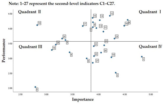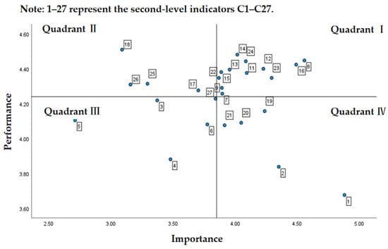 Based on the survey data, the mean importance scores (I1 = 3.8519, I2 = 3.8511) and the mean satisfaction scores (P1 = 3.5606, P2 = 4.2399) are utilized as the intersection points for the construction of the Importance–Performance Analysis (IPA) diagram. This analysis effectively visualizes the 27 indicators related to the impact of rural tourism on the revitalization of rural areas, as illustrated in Figure 4 and Figure 5.