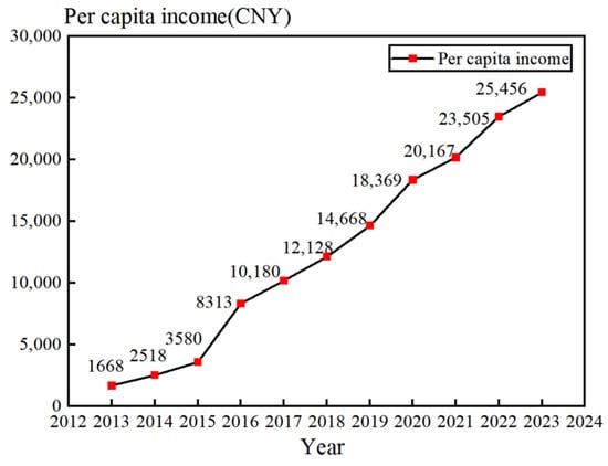 Per capita income of Shibadong Village from 2013 to 2023. Note: derived from internal statistical data of Shibadong Village.