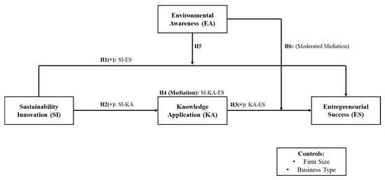 In addition to the KBV theory, entrepreneurial success and sustainability innovation have the potential to access, generate, and effectively utilize knowledge applications, which in turn can lead to long-term business success. Firms can develop and implement practices and strategies through collaboration with their members, paving the way for future sustainability initiatives. KBV plays a crucial role in achieving enhanced performance and efficiency [18,44]. KBV concurs that entities with coordination and integration with regard to organizational requirements can create, store, and utilize knowledge [45]. SMEs deeply intertwine sustainability innovation and entrepreneurial success. Integrating sustainability into business practices not only addresses environmental and societal challenges but also drives competitive advantage, operational efficiency, and long-term viability. Staying ahead of environmental regulations minimizes the risk of operational disruptions. For SMEs, sustainability is not just an ethical choice; it is a strategic imperative for entrepreneurial success. A sustainable business model today ensures long-term profitability and relevance in a rapidly evolving global economy [4,32]. Grounded in the theoretical foundations and prior studies, the following is hypothesized: