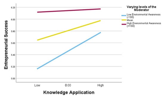 Environmental awareness moderates the relationship between sustainability innovation and entrepreneurial success, such that the relationship is weaker for SMEs with low environmental awareness.