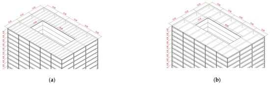 Axonometric plans: (a) scenarios AT20 and SC-TBD40; (b) scenarios AS20L and AS40L.