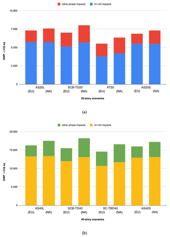 This study’s findings reveal that the total environmental impacts of the North American best-case scenarios range from 129 to 200 kg CO2 equivalent per square meter, measured using the IPMS 4.2 standard. In comparison, the European best-case scenarios exhibit lower total impacts, ranging from 97 to 173 kg CO2 equivalent per square meter. These figures reflect the impact of the above-grade structural systems alone, excluding foundations. These results are obviously lower when compared to the references used in the literature review (see Section 1, Introduction), as they were assessed with a different scope—the entire building. Interestingly, the study conducted by Eslami et al. [23] reported a lower total for the timber alternative than that reported by this current study; this difference can be attributed to the fewer number of stories—only two.