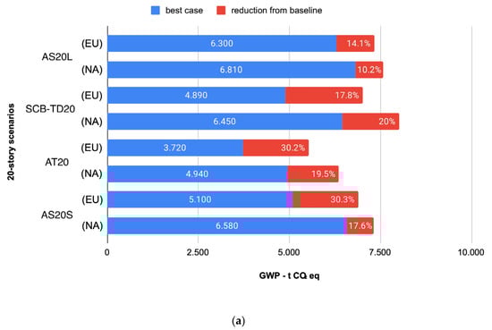 The results for the best-case scenarios (those where materials are selected based on the smaller GWP indicator reported in their EPDs) for both European and North American cases are shown in Table 5. Looking at the total impacts, the reductions from the baseline cases are, on average, 25.7% for Europe and 16.3% for North America, as shown in Figure 5a,b. These figures indicate that products with lower environmental impacts are more readily available in the European market compared to North America. This disparity could be attributed to varying regulations, market demands, and the availability of sustainable materials in the respective regions. Among all scenarios, the all-timber scenario (AT20) demonstrates the most substantial reductions in environmental impacts. For Europe, this scenario achieves a notable reduction of 48.7%, while in North America, the reduction is 28.7%. The higher-impact reductions in the former could be due to the more advanced or widespread use of sustainable timber products and practices.