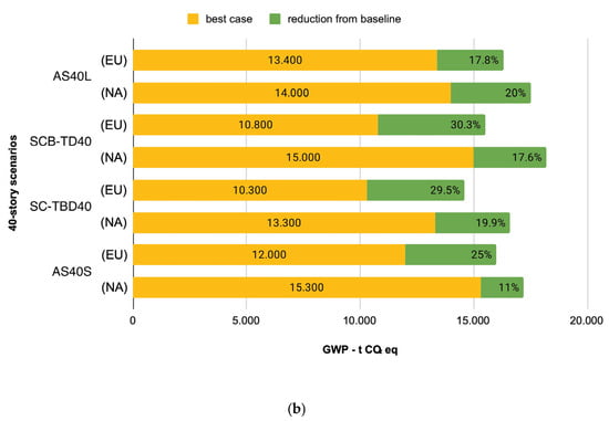 (a) Total impacts of best-case alternatives and reductions from baseline cases for 20-story scenarios, shown for Europe (top bar) and North America (bottom bar). (b) Total impacts of best-case alternatives and reductions from baseline cases for 40-story scenarios, shown for Europe (top bar) and North America (bottom bar).