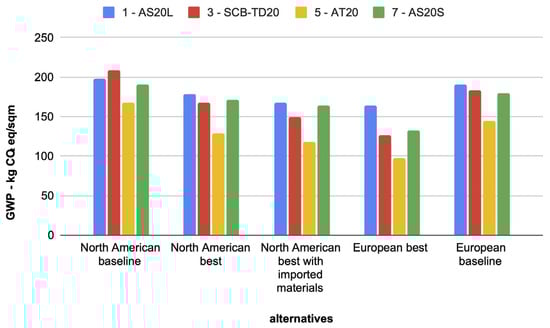 The initial condition for the “best with imported materials” alternative was met for both structural steel and timber, with European products demonstrating a more than 10% lower environmental impact compared to their North American equivalents. This alternative thus assumes the use of the most efficient European products in a North American building project (Figure 6).