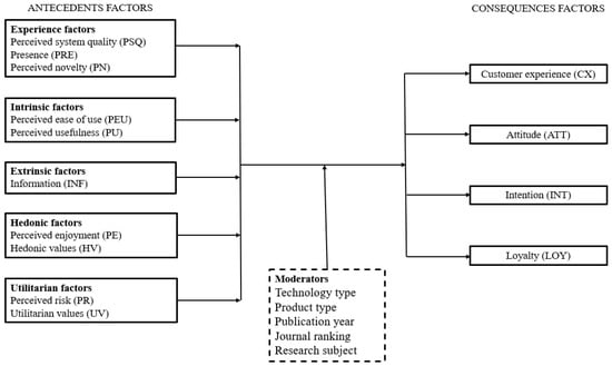 Customer experience (CX) denotes the subjective and internal response of individuals who engage directly (e.g., through purchasing, receiving services, or product usage) or indirectly (e.g., through word-of-mouth recommendations, criticisms, or advertisements) with companies [53]. Businesses recognize that the key to achieving success lies in delivering exceptional shopping experiences to their customers [54]. This is because a remarkable customer experience has the potential to influence customers’ purchase intentions [55]. For example, the ability to physically interact with products or to experience them through AR or VR devices heightens the customer experience, exerts a positive influence on their attitudes, and facilitates their decision-making process.