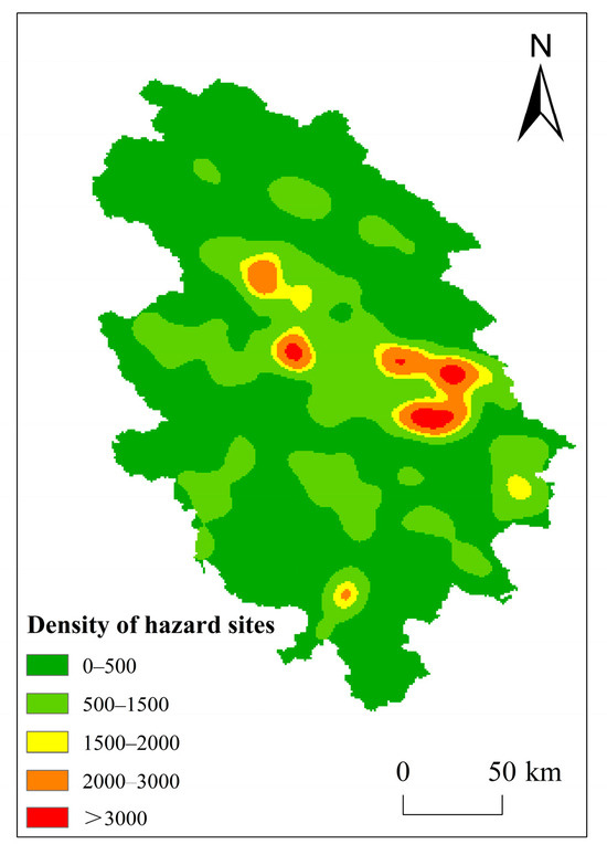 The geohazard data were sourced from the Resource and Environmental Science and Data Center, covering six major categories: collapses, subsidence, mudslides, geocracks, landslides, and slopes. These data were compiled up to approximately 2019. The kernel density of geohazard points was calculated using ArcGIS (10.8) to evaluate the stability of the disaster-pregnant environment.
