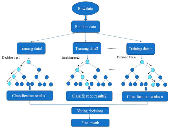 Random forest, introduced by Leo Breiman, is a data mining technique used for classification and regression using decision trees. The model is a nonparametric supervised machine learning classifier that utilizes multiple aggregated random decision trees to classify datasets based on the prediction patterns of all decision trees [37]. By combining the modeling capabilities of decision trees with the benefits of ensemble learning, the model offers high flexibility and robustness [36]. During the training process of a random forest, samples are randomly selected from the original dataset to form subsets. Each decision tree is trained on a different set of samples and feature sets. A hierarchical decision tree is constructed by recursively partitioning the feature space into smaller subspaces. Increasing the number of decision trees enhances the accuracy of the random forest model’s predictions. Moreover, a higher number of trees reduces the likelihood of overfitting [38]. In random forest classifiers, the final result is determined through majority voting. Each decision tree outputs a classification, and the category with the highest occurrence is selected, ensuring the minority aligns with the majority to reduce generalization error [39]. As a result, random forests have a significant advantage in addressing nonlinear problems [40].