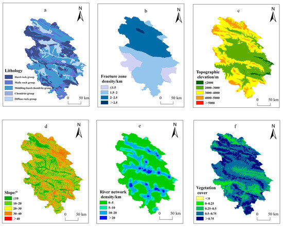 Spatial characterization of the static disaster-pregnant environment in the study area. (a) Lithology, (b) fracture zone density, (c) topographic elevation, (d) slope, (e) river network density, (f) vegetation cover.