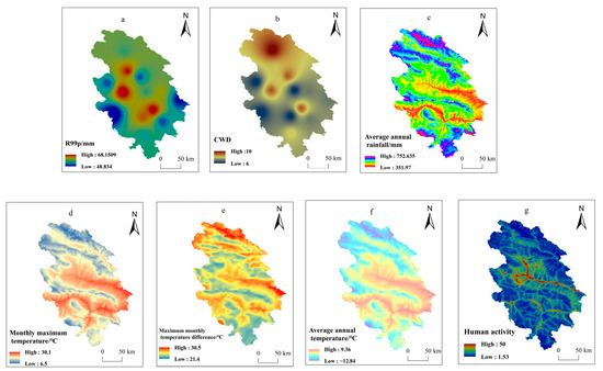 Spatial characterization of the dynamic disaster-pregnant environment in the study area, 2003–2022. (a) R99p, (b) CWDs, (c) average annual rainfall, (d) monthly maximum temperature, (e) maximum monthly temperature difference, (f) average annual temperature, (g) human activity.