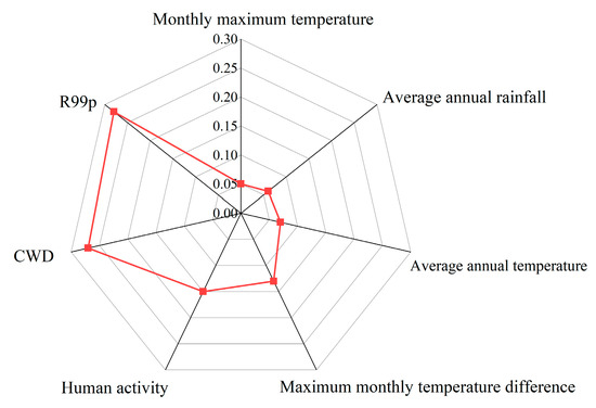 Using random forest modeling, the YHV geohazard dynamic disaster-pregnant environment stability model was developed. Each indicator factor was weighted as the dependent variable, while individual indicators were treated as independent variables. The final dataset was input into the random forest model to determine the relative importance of each influencing factor. As shown in Figure 6, the primary factors influencing geologic disasters include R99p, CWDs, human activities, maximum monthly temperature difference, average annual temperature, average annual precipitation, and maximum monthly temperature. Extreme meteorological events play a significant role in destabilizing the disaster-pregnant environment, making it more susceptible to geologic disasters.