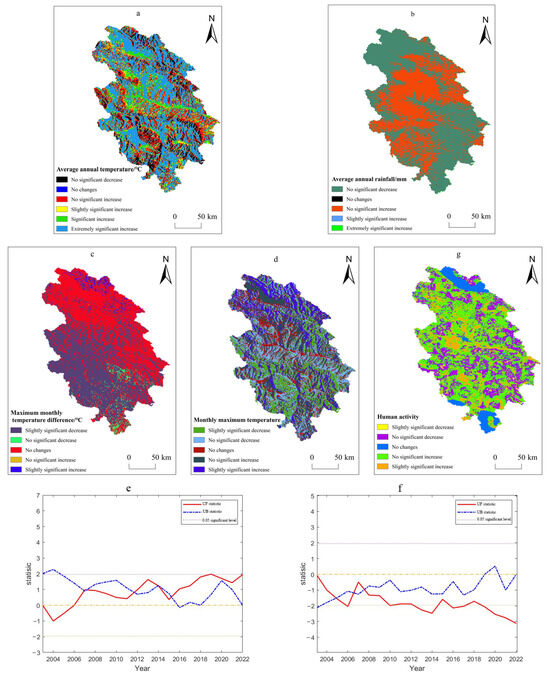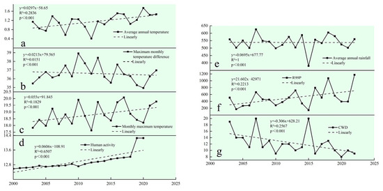 Trend features and significance tests of the dynamic disaster-pregnant environment. (a) Average annual temperature, (b) average annual rainfall, (c) maximum monthly temperature difference, (d) monthly maximum temperature, (e) R99p, (f) CWDs, (g) human activity.