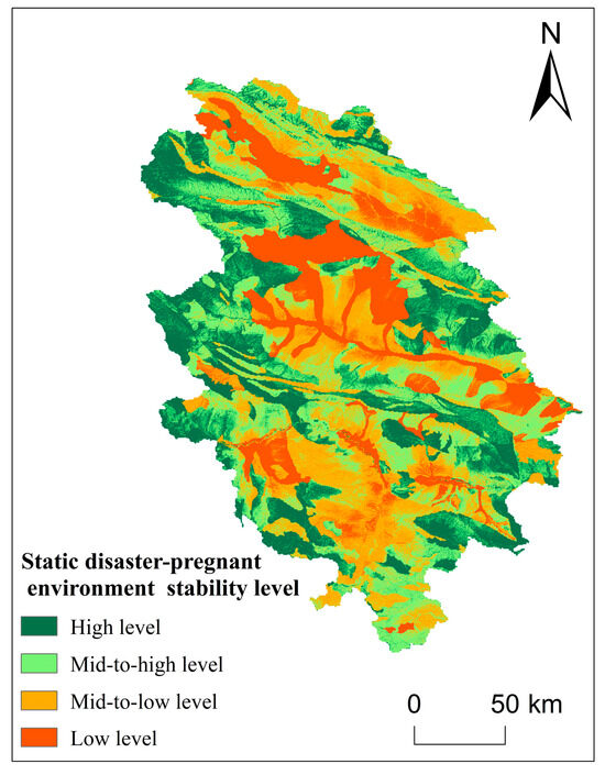 Using the natural breakpoint method, the stability levels of the YHV geologic disaster static disaster-pregnant environment were classified into four grades: high, medium-high, medium-low, and low. As shown in Figure 9, the static disaster-pregnant environment in the region is predominantly medium-high stability, covering an area of 11,277.10 km2, which accounts for 32% of the study area. The high stability area covers 8591.34 km2, or 24% of the study area. The medium-low stability area spans 9446.52 km2, making up 27% of the study area, while the low stability area covers 6011.10 km2, representing 17% of the study area.