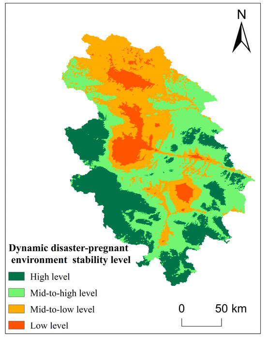 Using the natural breakpoint method, the YHV geologic disaster dynamic disaster-pregnant environment stability levels were classified into four grades: high, medium-high, medium-low, and low. As shown in Figure 10, the dynamic disaster-pregnant environment in the region is predominantly of medium-low stability, covering an area of 12,936.11 km2, which accounts for 37% of the study area. The high stability area covers 9018.08 km2, or 26% of the study area. The medium-high stability area spans 10,530.23 km2, representing 30% of the study area, while the low stability area covers 2841.63 km2, accounting for 8% of the study area.