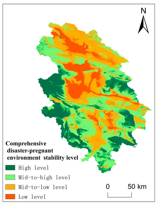 Using the natural breakpoint method, the comprehensive stability of the YHV disaster-pregnant environment was classified into four grades: high, medium-high, medium-low, and low. As shown in Figure 11, the comprehensive stability of the disaster-pregnant environment is predominantly medium-high, covering 12,546.97 km2, which accounts for 36% of the study area. The high-stability area spans 7140.84 km2, representing 20% of the study area. The medium-low stability area encompasses 11,057.66 km2, accounting for 31% of the study area, while the low-stability area covers 4487.88 km2, comprising 13% of the study area.