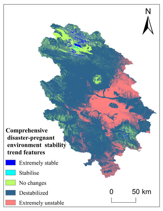 (3) The stability trends of the integrated disaster-pregnant environment indicate widespread instability, with extremely unstable areas predominantly located in river valleys due to the influence of human activities. Conversely, only 0.1% of the area shows a tendency toward stability, while 2.1% tends to be extremely stable.
