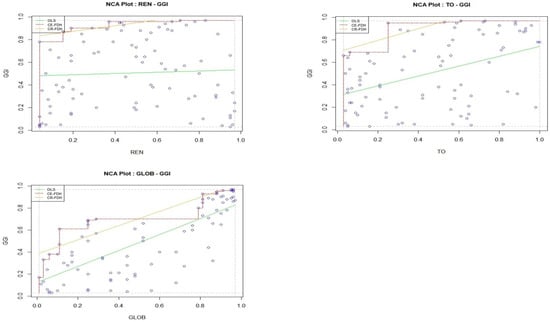 Although fsQCA is effective for identifying the interplay among various factors influencing green growth, it does not provide precise information for identifying necessary variables. Therefore, the NCA method is employed to address this limitation and identify essential factors [104,105,106]. Integrating NCA and fsQCA offers a comprehensive framework for analyzing necessary and sufficient conditions. NCA identifies the fundamental variables that act as prerequisites, while fsQCA examines how these and other factors combine to achieve different levels of green growth. This combination provides deeper insights into causal relationships and the ability to address both compensatory and non-compensatory effects.