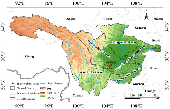 The Yangtze River is the largest river in China and Asia, and the third-largest river in the world. As the largest and most important river basin in China, the Yangtze River Basin shoulders important ecological and economic functions [7]. The study area of this paper is the upper Yangtze River Basin, with latitude and longitude 90° E~112°30′ E and 25° N~35°54′ N (Figure 1), which is 4504 km long, controlling a basin area of 1,000,000 square kilometers, with large drop, deep canyons and turbulent flow. The main tributaries are the Yalong River, the Minjiang River, the Tuojiang River, the Jialing River, and the Wujiang River. The region is characterized by a subtropical monsoon climate, and the river basin has the most important ecological and economic functions. The region belongs to the subtropical monsoon climate and plateau monsoon climate: hot and humid in summer, cold and dry in winter. Due to the complex topography, climate change is large, and the temperature in high-altitude areas is significantly lower than that in low-altitude areas. Precipitation is mainly concentrated in the summer months, especially from June to August, when there is more rainfall because it is the rainy season [23]. Vegetation types are abundant, including savanna, grassland and meadow, coniferous forest area, deciduous broad-leaved forest area, mixed forest, etc. With the implementation of a series of ecological projects, the vegetation condition has improved, but the ecological environment of the region is still very fragile, natural disasters occur frequently, and the ecological problems are still significant [24]. In this paper, the upper Yangtze River region is divided into Jinsha River Basin, Min-Tuo River Basin, Jialing River Basin, Wujiang River Basin, and Three Gorges Reservoir Basin, according to the natural watersheds.