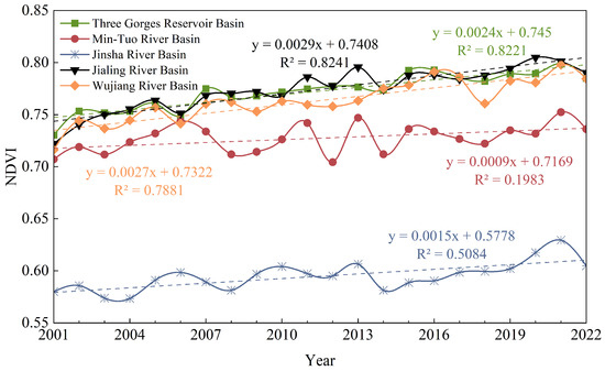 Annual variation of NDVI in various basins in the upper reaches of the Yangtze River from 2001 to 2022.