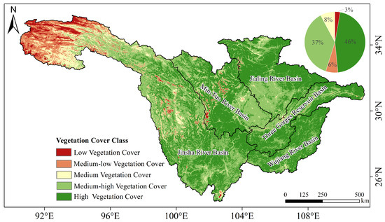 The spatial distribution of NDVI in the upper reaches of the Yangtze River from 2001 to 2022 is shown in Figure 3. Based on the actual situation, this study utilized the equal-interval method to classify the spatial distribution of NDVI into five types: low vegetation cover (0 < NDVI ≤ 0.2), medium–low vegetation cover (0.2 < NDVI ≤ 0.4), medium vegetation cover (0.4 < NDVI ≤ 0.6), medium–high vegetation cover (0.6 < NDVI ≤ 0.8), and high vegetation cover (0.8 < NDVI ≤ 1.0). The overall condition of NDVI in the region is good, with a mean value of 0.7, and the overall trend is increasing from northwest to southeast. Low vegetation cover is mainly concentrated in the Jinsha River basin, which includes the eastern part of the Tibetan Plateau and the Hengduan Mountains area, where the ecological environment is affected by the high altitude and the cold and dry climate, so the vegetation is relatively sparse. Compared to the western plateau, the eastern and southern reaches of the Yangtze River are characterized by a humid climate, abundant water resources, fertile soils, and less human interference, all of which combine to produce a relatively good vegetation cover.