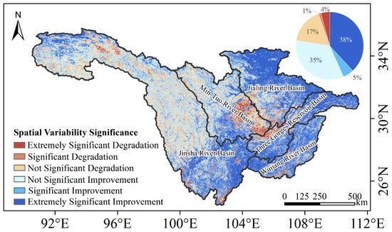 Combining the annual maximum NDVI data of the study area from 2001 to 2022, the corresponding data were imported using MATLAB, and the spatial trend of NDVI in the study area was obtained based on the Sen + Mann–Kendall trend analysis method (Figure 4). It was found that the study area as a whole was dominated by an improving trend, with an area share of 78%, which was mainly concentrated in the Jialing River basin, most of the basins in the Three Gorges Reservoir area, and the Wujiang River basin. The degradation trend was dominated by the Jinsha River Basin and the Sichuan Basin area in the Min-Tuo River Basin, accounting for 22% of the area. Overall, the area of improvement in the upper reaches of the Yangtze River is much larger than the area of degradation, and the overall state of vegetation cover shows a trend of continuous improvement.