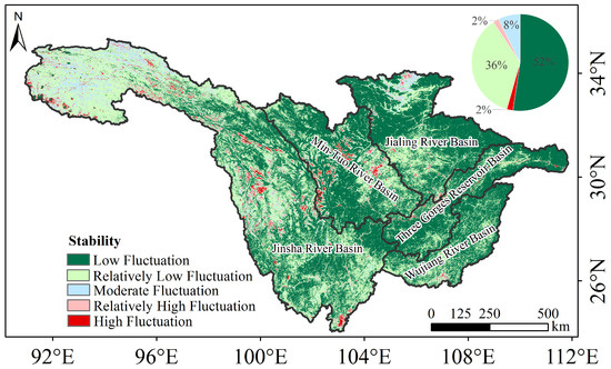 The analysis of spatial variability in NDVI data in the Yangtze River Basin from 2001 to 2022 showed that the vegetation dynamics in the study area were characterized by significant spatial heterogeneity (Figure 5). From the viewpoint of spatial distribution pattern, the coefficient of variation for NDVI in the study area ranged from 0 to 3.004, and the overall spatial distribution pattern of “high and low fluctuations coexist, low fluctuations dominate, and regional differentiation is significant” was presented. Among them, the low-fluctuation area (52%) and the relatively low-fluctuation area (36%) were mainly distributed in the lower reaches of Jinsha River, the southern part of Min-Tuo River, and the northern part of Jialing River Basin in the Longnan Mountains. The vegetation cover in these areas remained relatively stable thanks to the barrier effect of the mountainous terrain. It is worth noting that the higher-fluctuation area and the high-fluctuation area show significant spatial coupling characteristics with the river system, and its distribution pattern is closely related to the inter-annual flow changes of tributaries [34]. At the same time, there are also sporadic distributions around the built-up areas of the city and near the snow line of the high mountains; the latter is mainly affected by the changes in the snow line, with an area proportion of about 4%.