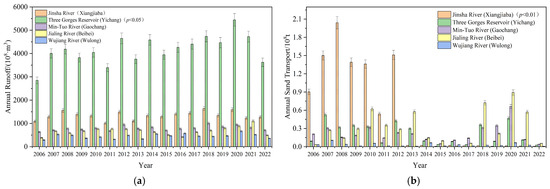 Based on the hydrological observation data of the Yangtze River Basin from 2006 to 2022 (Figure 6), the analysis shows that the annual runoff volume of each sub-basin generally shows a non-significant increase, with the Three Gorges Reservoir area leading the way in terms of average annual runoff volume, which is significantly higher than that of other regions. In terms of sand transport, the Jinsha River basin was always in the leading position before 2013, but with the commissioning of the Xiangjiaba and Luoxidu power stations, the backbone of the “West-East Electricity Transmission”, upstream from the Pingshan Station in 2012 and 2013 [35], respectively, their sand retention effect has been enhanced significantly, and they have become the key driving factors influencing the evolution of water and sand in the lower reaches of the Jinsha River [36,37]. Statistical analysis of the runoff and sand transport in each sub-basin during the study period by the M-K trend test showed that only the runoff in the Three Gorges Reservoir area showed a significant change (p < 0.05), while the sand transport in the Jinsha River showed a significant downward trend (p < 0.01); the rest of the basins did not reach the level of significance.