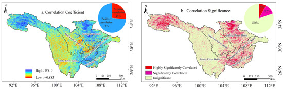 Spatial distribution of NDVI and precipitation correlation coefficients (a) and correlation coefficients significance (b) in the upper Yangtze River Basin from 2001 to 2022.