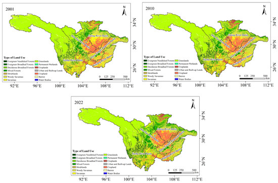 Distribution of land cover types in the Upper Yangtze River Basin in 2001, 2010, and 2022.