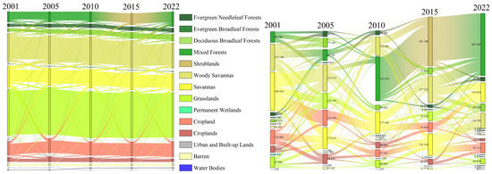 The land transfer analysis showed (Figure 9) that, between 2001 and 2022, the areas of woody prairie, savanna, grassland, shrubland, permanent wetland, and cropland in the Upper Yangtze River Basin showed a decreasing trend, with net decreases of 122,132 km2, 141,386 km2, 37,578 km2, 4365 km2, 6498 km2, and 48,198 km2. Meanwhile, the land area of mixed forest, evergreen coniferous forest, deciduous broad-leaved forest, evergreen broad-leaved forest, farmland, water bodies, and urban and built-up areas showed an overall increasing trend; in particular, the areas of mixed forest and deciduous broad-leaved forest increased significantly, with net increases of 147,856 km2 and 129,834 km2, respectively. Between 2001 and 2005, there was a significant expansion in the area of forested land, mainly originating from the transfer of savanna and shrubland, while, between 2005 and 2010, there was a significant outflow of woody prairie, cropland, and farmland, mainly to savanna and forested land. Between 2010 and 2015, the land use change was more dramatic, with mixed forests decreasing by 352,876 km2 and shifting mainly to shrubland. Between 2015 and 2022, significant shrublands and woody savannas were converted to woodlands, with an increase of 4299 km2 in urban and built-up areas. In addition, between 2001 and 2022, the total area of forested land in the Upper Yangtze River Basin increased by a net 9%, mainly due to the “Returning Cultivated Land to Forests” policy implemented since 2000, which encourages farmers to reduce the area of cultivated land and increase the area of forested land in order to reduce soil erosion and improve the ecological environment. At the same time, the area of cities and built-up areas has increased by 10,975 km2, reflecting the region’s rapid economic development and urbanization, which may also have led to a decline in vegetation cover.