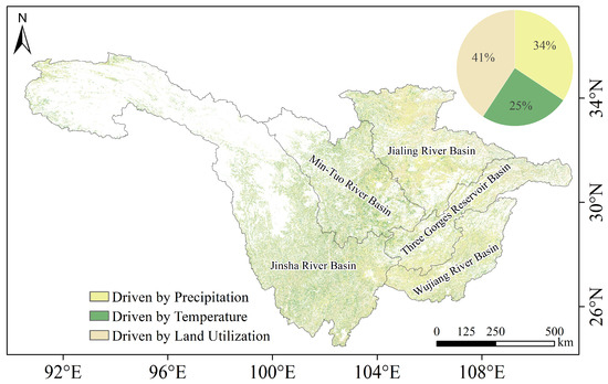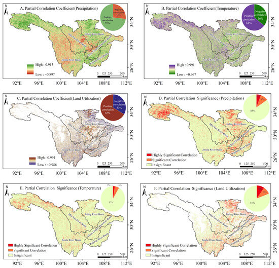 The results of the study based on the absolute value analysis of the partial correlation coefficient showed that the climate factor with the largest absolute value in the raster image was identified as the dominant driver affecting the NDVI of the regional vegetation [28] (Figure 11). Quantitative analysis showed that precipitation, temperature, and land use factors dominated 34%, 25%, and 41% of NDVI changes in the study area, respectively, with the land use factor having the most prominent degree of influence. The comprehensive study data indicate that the evolution of land use pattern is a key environmental factor triggering the dynamic changes of NDVI in the upper reaches of the Yangtze River.