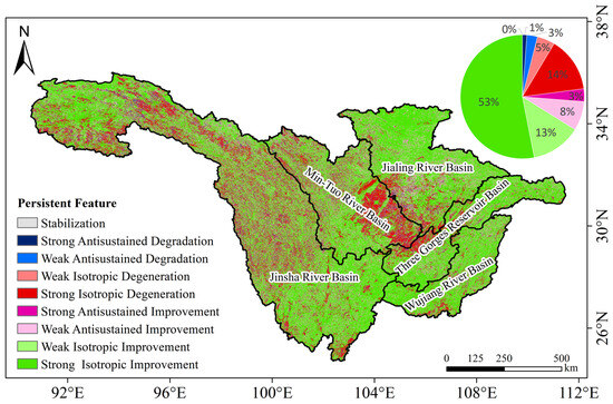 The spatial characteristics of vegetation changes in the Upper Yangtze River Basin over the past 22 years were studied; however, the future trends are not clear. The future trend of NDVI change in the upper Yangtze River region was predicted by combining it with the Hurst index, as shown in Figure 12. The results show that 75% of the overall vegetation change exhibits persistence, implying that the trend of NDVI change in most regions may continue the pattern between 2001 and 2022. Within this, the proportion showing a strong isotropic trend was 46%. In contrast, 25% of the vegetation change trends were characterized by anticontinuity.