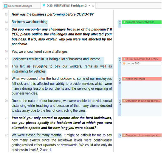 Data for this research comprised 12 interviews conducted with 12 SMME owners or managers in uMhlathuze Municipality to establish the kind of challenges COVID-19 imposed on these SMMEs. Each interview was assigned a code for identification, such as participant 1, participant 2, right up to participant 12. After, all the audio recorded interviews were “transcribed through reproducing them verbatim as a word-processed account” [45].