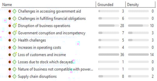 As shown in Figure 1, the challenges of “loss of customers and income” and “disruption of business operations” were outstanding challenges with grounded values of 36 and 28, respectively. In Atlas.ti, grounded values reveal the number of text segments or quotations that were coded with a particular theme [45]. In other words, these two challenges have a lot of codes attached to them (high grounded values) because they affected all the participants in this research. A further analysis of each of the themes shown in Figure 2 follows below.