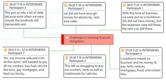 Relating to difficulties in fulfilling financial obligations, research indicated that some SMMEs had challenges in paying rents and salaries as well as vehicle and housing mortgages during the pandemic because of decline in income triggered by many pandemic related challenges. These results mirror the findings made by refs. [5,8], stating that lockdowns and concomitant business closures and reduced business activity left many SMMEs struggling financially. Furthermore, a report by Ref. [25] reveals that some SMMEs defaulted on their mortgages and other debts because of prolonged lockdowns.