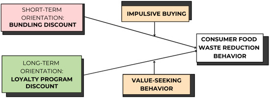 This research investigates the effect of two kinds of discounts, bundling and loyalty membership, on consumer food waste reduction behavior. Bundling discounts, which are short-term in nature, are expected to affect consumer behavior through impulsive buying as a moderator, in which consumers always tend to buy more products without much earlier planning. Meanwhile, loyalty member discounts are long-term in nature; thus, they are assumed to influence food waste reduction behavior through value-seeking, with consumers having more regard for the derived long-term value from their purchases. This research aims to understand how these short-term and long-term mechanisms interact with consumer behavior in terms of food waste reduction. The following are the hypotheses of this study:
